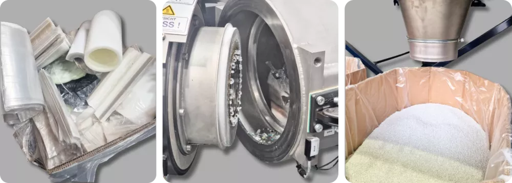 In-house recycling means that production waste is collected and processed directly at the manufacturing site. The scrap is shredded, melted, filtered and pelletized into new plastic granulate that can be fed back into the production line. Because the material never leaves the facility, its composition and cleanliness remain controlled, which allows the recycler to produce high-quality pellets suitable for new film or sheet production. This system significantly lowers the demand for virgin polymer and ensures a predictable raw-material flow.