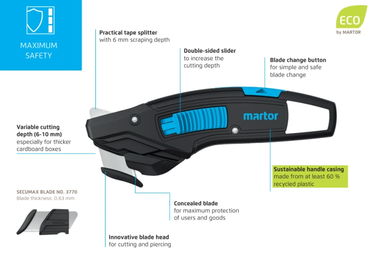 Martor SECUMAX 370 370001.02 | Couteau de sécurité à lame escamotable, profondeur de coupe variable de 6 à 10 mm